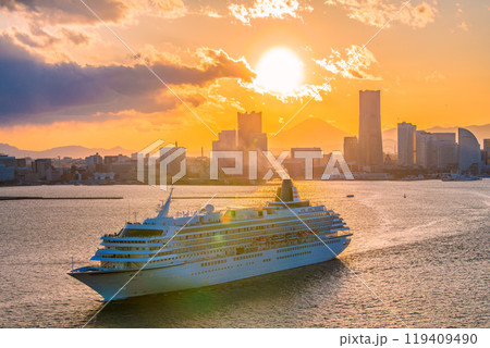 日本の横浜都市景観 富士山やみなとみらい、マリーンルージュ、クルーズ船、桜木町駅方向などを望む