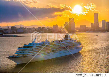 日本の横浜都市景観 富士山やみなとみらい、飛鳥Ⅱ、桜木町駅方向などを望む