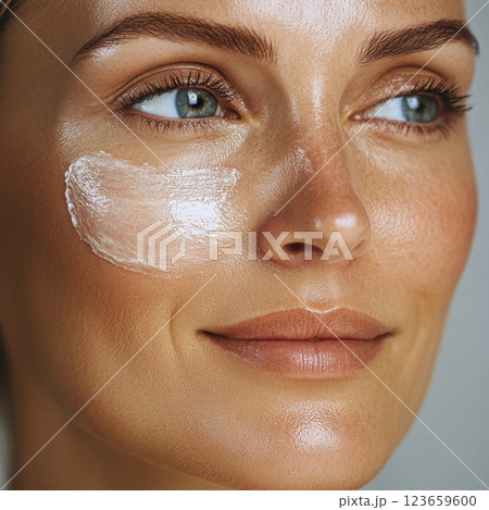 woman applying skincare cream on her face, showcasing healthy skin and natural glow. image captures moment of self care and beauty routine