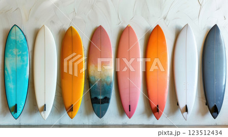 surfing, a row of bright multicolored surfboards, horizontal banner, light beach background, minimalism, copy space, free space for text