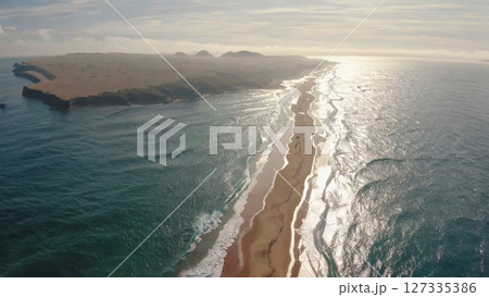 Aerial view of golden sandy sotavento beach in fuerteventura, sunlight reflecting off turquoise ocean waters surrounding pristine coastal landscape