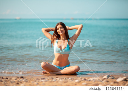 Summer vacation. A young smiling caucasian woman sitting crossed legs on the oceans beach