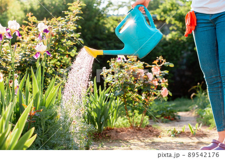 A woman waters flowers and plants in her garden with a watering can. Close up. Gardening concept