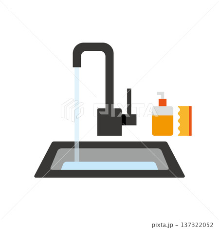 黒蛇口シンクにスポンジと水が流れるフラットイラスト