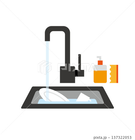 黒蛇口シンクに食器と水が流れるフラットイラスト