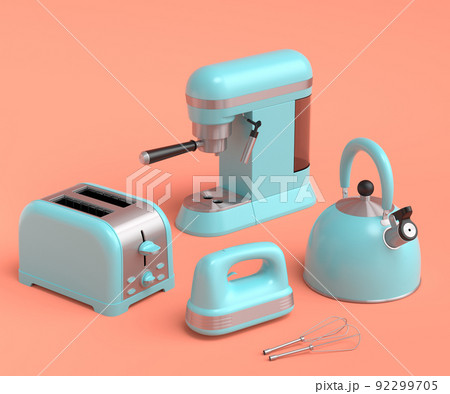Espresso coffee machine, hand mixer, kettle and toaster on blue background.