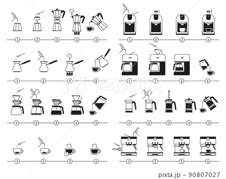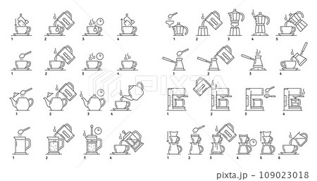 Tea or coffee brewing instruction. Tea, coffee making, brew process icons.