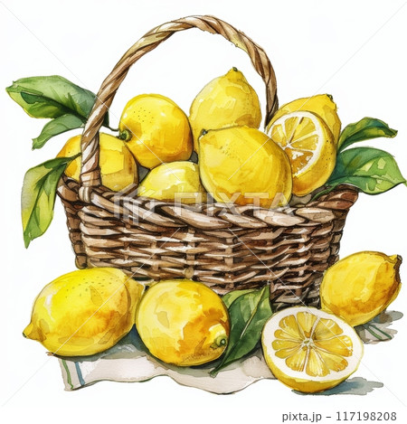 A colorful basket overflows with fresh lemons, beautifully enhanced by lush green leaves surrounding it