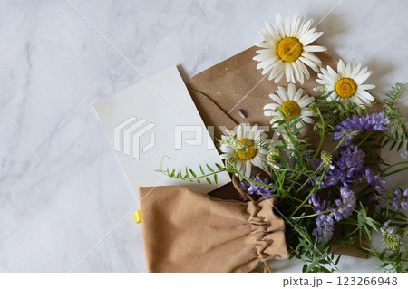 Florist at work: a pretty woman prepares a summer bouquet of white gypsophila on a gray desk. Kraft paper, scissors, greeting envelope on the table. View from above. The composition is flat.