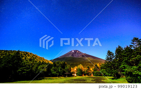 富士山スカイラインの水ヶ塚公園から富士山と北天の星空のZTF彗星を望む(静岡県)
