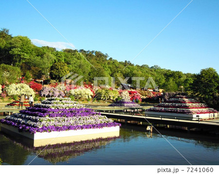 春のあしかがフラワーパークの水上花壇 ペチュニアのピラミッド