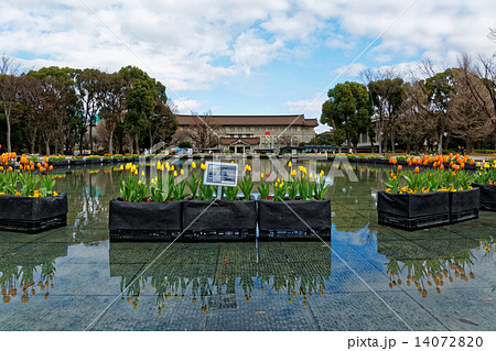 上野公園噴水広場の早咲きのチューリップと東京国立博物館