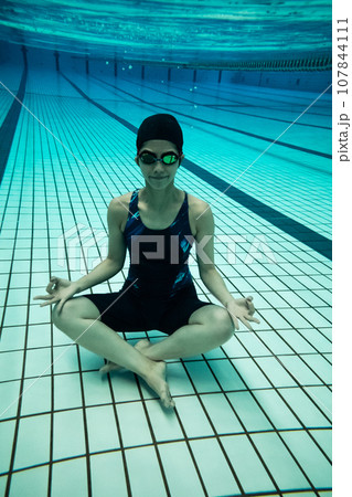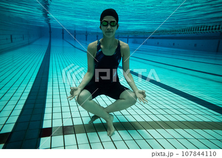 Man under water in a swimming pool to relax in the lotus positio