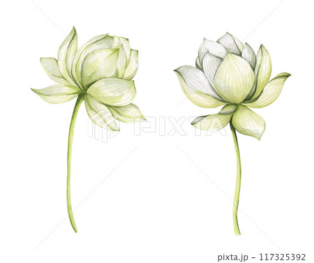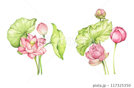 Watercolor set with botanical illustration of lotus flowers.