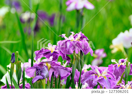 初夏の公園 綺麗に咲く花菖蒲