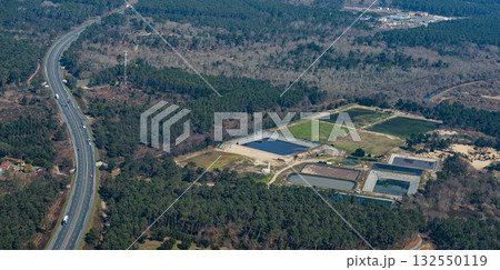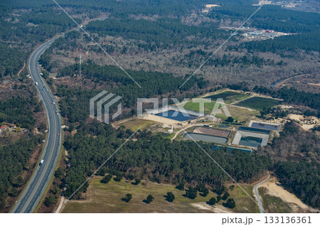 Aerial view of water treatment facilities surrounded by lush greenery