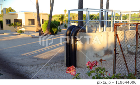 Water treatment plant in a landscaped area with pipes and facility buildings during the golden hour