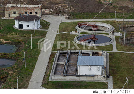 Wastewater treatment facility in a rural area showcasing circular tanks and processing buildings