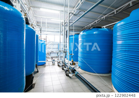 Blue tanks in a modern industrial facility for water treatment operations