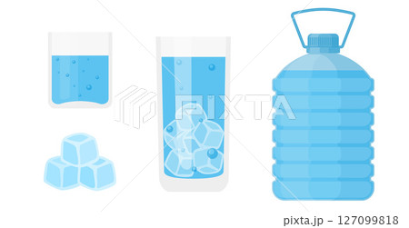 Water and Ice Collection Featuring Glasses of Water, Ice Cubes, and Large Water Bottle
