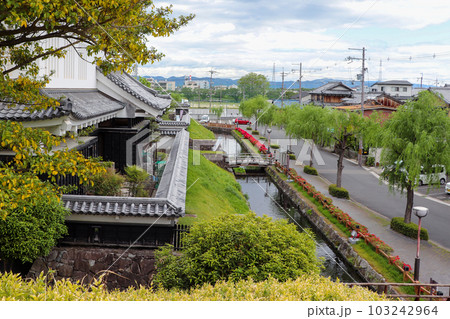 八幡山城の八幡堀と民家の町並み(近江八幡の水郷)