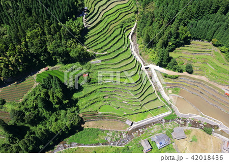 石積みの棚田(八女市星野村)2018年は豪雨水害の為田植えができないとのこと。水路破損のため。