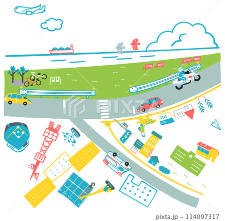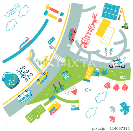 海の見える繁華街での生活を描いた俯瞰イラスト素材セット