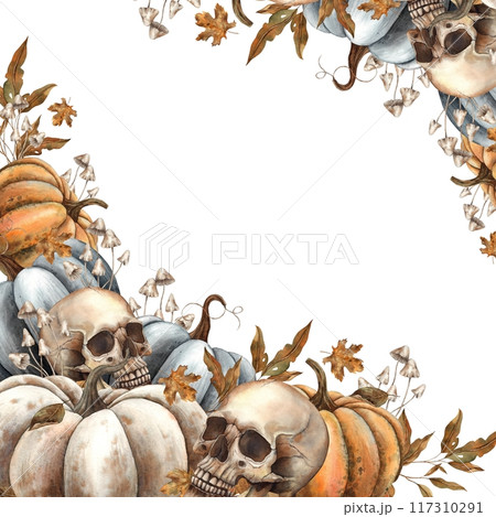 Orange, white and black pumpkin, skull, autumn leaves, mushrooms. Hand drawn watercolor frame in gothic style. For design, packaging, cards, autumn posters, Thanksgiving, Halloween, witchcraft