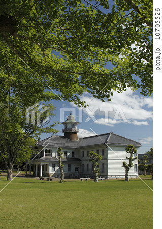 明治のハイカラ校舎「旧水海道小学校本館」:「茨城県立歴史館」敷地内にあるロマンチックな、憧れの、白い擬洋風建築。新緑映える季節に。TV・映画・CM・モデル撮影等に使われている。人物なし。