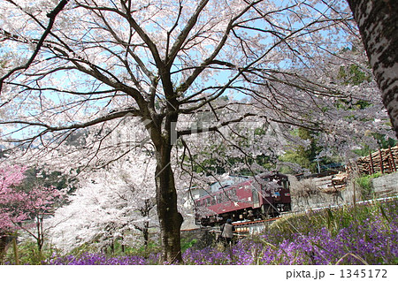 わたらせ渓谷鐵道「水沼の公園から見た桜とトロッコわっしー号」
