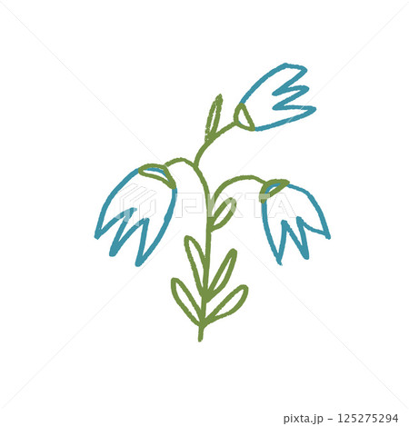 Bellflowers crayon drawn. Spring tiny plant doodle isolated on white background. Summer floral kids element. Chalk or pastel style childish scrawl nature shape. Vector naive illustration by pencil