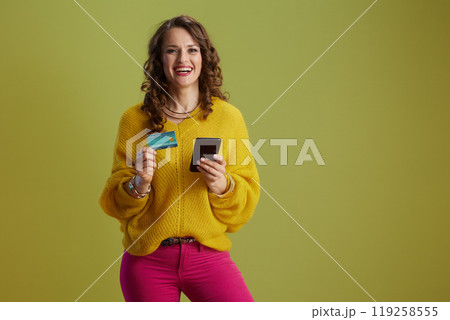 Beautiful happy brunette woman in black leather jacket and black hat holding light blue handbag