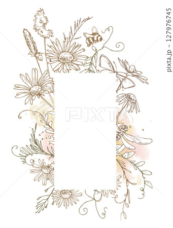 Floral rectangular frame with wildflowers, herbs, and butterflies in line art and watercolor. Ideal for invitations, text templates, packaging, or eco branding. Delicate and hand-drawn natural style.