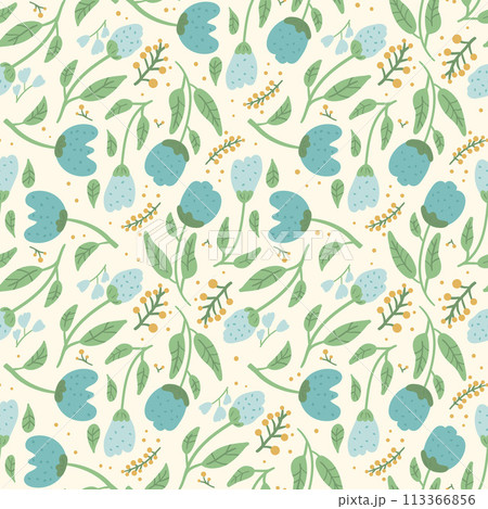 Abstract botanical plants and flowers, seamless pattern vector illustration. Repeating floral print in pastel colors on beige background. Graphic design for Wedding invitation Cover Wrapping Textile