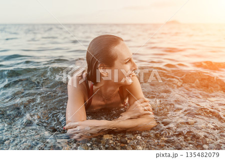 Woman, beach, ocean: happy woman relaxes in shallow sea water enjoying golden hour sunset