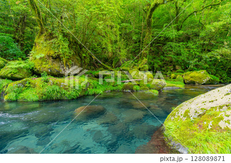 熊本阿蘇 白川水源の透明な湧水と清流の風景
