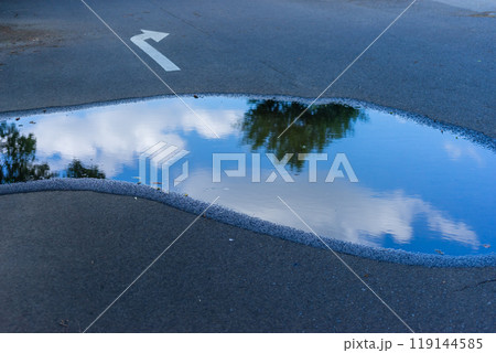 道路の水たまりに映る青空