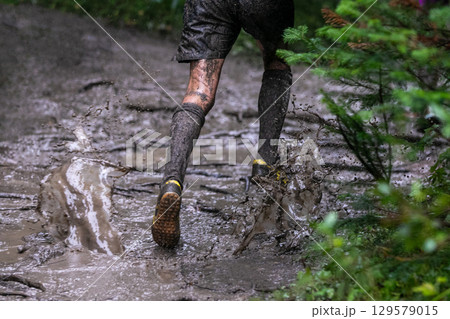 Legs athlete running puddles of mud in heavy rain during forest marathon
