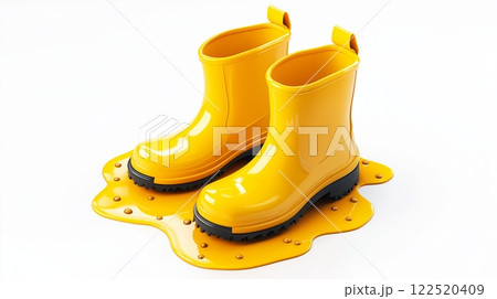 3D pair of yellow rain boots with puddles of water on a clean white background. Spring rain and outdoor activity concept.