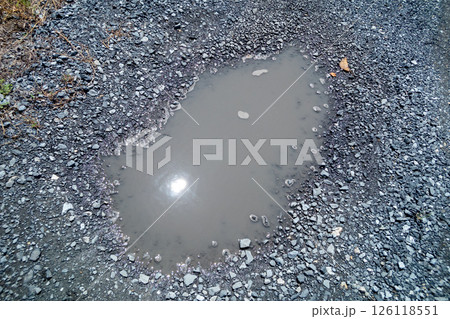雨上がりの砂利道にできた水たまり