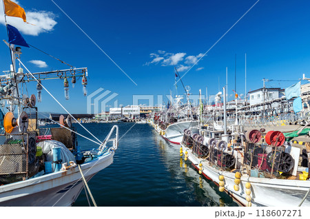 【青森県:漁港】漁港に多数の漁船が係留されている