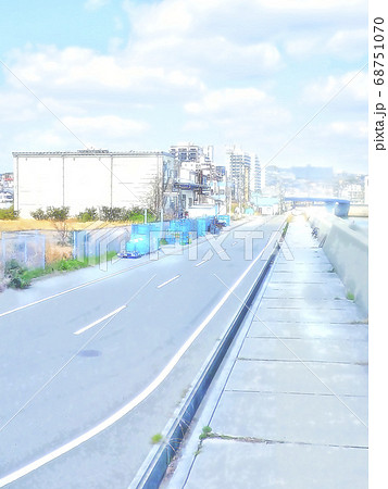 漁港の日常風景 水産加工場と空と雲【縦構図】