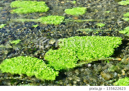 湧水川に生える鮮やかな緑色の梅花藻クローズアップ
