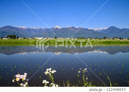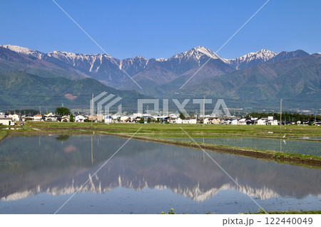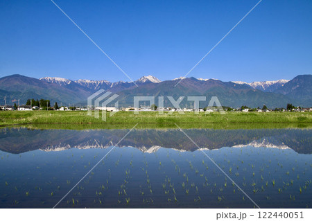 安曇野からの水田と北アルプス・西方面(長野県・安曇野市)水田とアルプス,日本アルプス,アルプスの山々