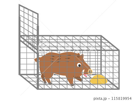 イノシシが箱罠に捕まったイラスト、捕獲された猪