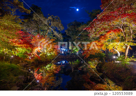 新潟・弥彦公園 ライトアップされた月夜のもみじ谷