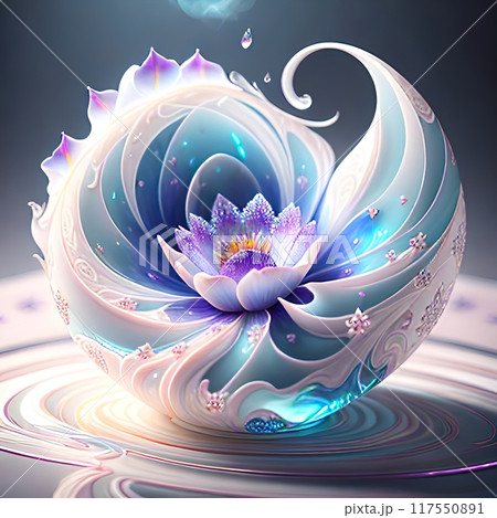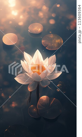 霧に包まれた神秘的な幻想の湖に、大きな蓮の花が優雅に咲き誇る。柔らかい朝の光に照らされるこの静寂な風