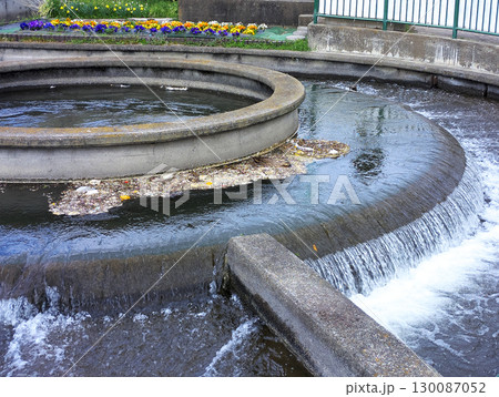 高崎市 長野堰用水 円筒分水の水上ごみをあさるカルガモ