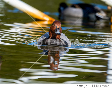優雅に泳ぐ白鳥の後ろ姿と鴨