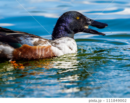 池を泳ぎながらパンクズを食べるハシビロガモ